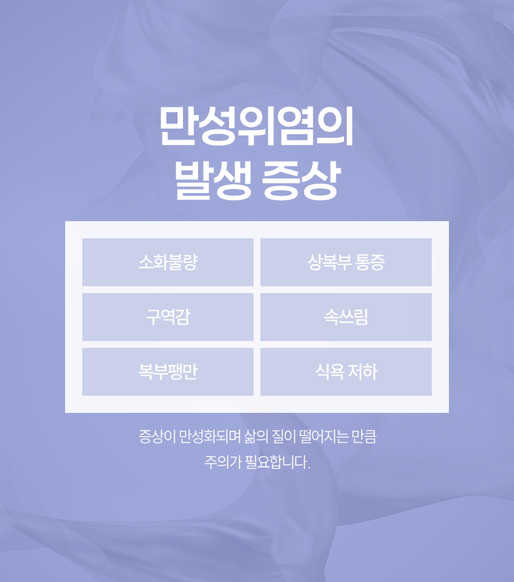 만성 위염에 노출되면서 찾아오는 흔한 증상으로는 통증, 더부룩함, 조기 포만감과 메스꺼움, 구토, 식욕부진 등이 있습니다. 심해질 시 체중이 줄어들거나 흑색변을 보는 등의 문제가 동반되기도 합니다.